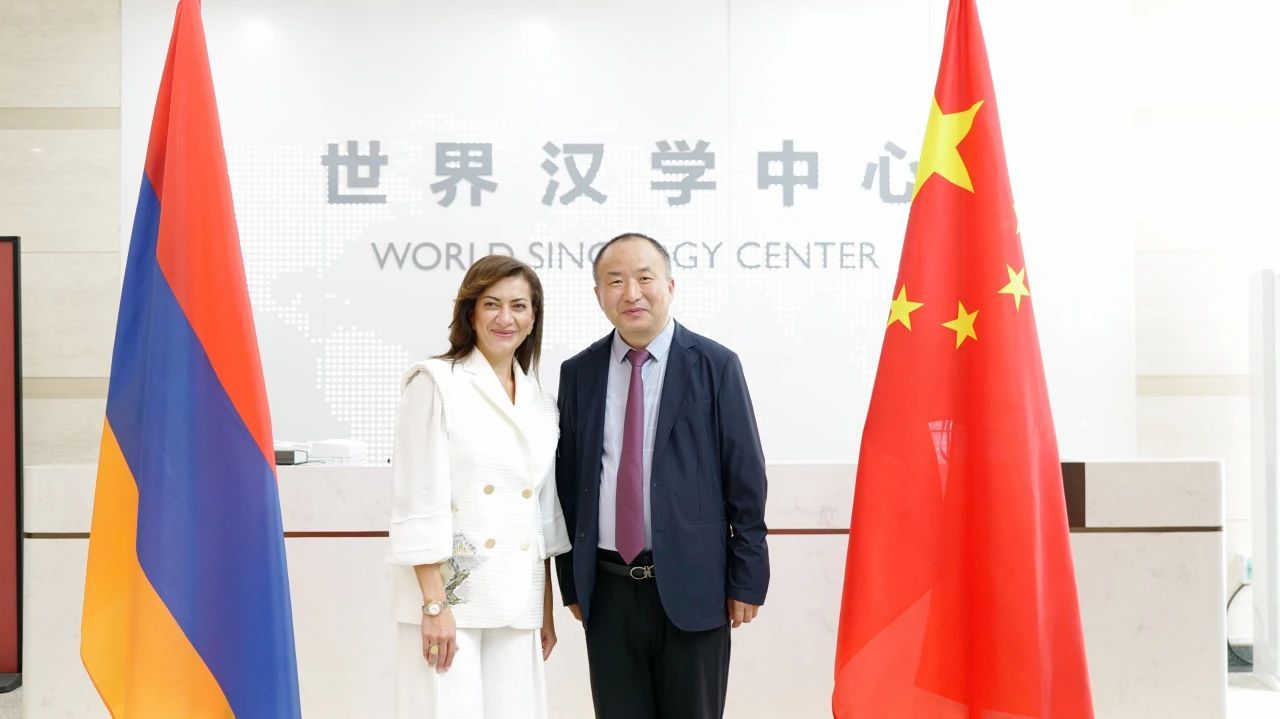 2024年9月10日上午,亚美尼亚总理夫人、“My Step”慈善基金会执行董事安娜·哈科比扬访问世界汉学中心,与北京语言大学世界汉学中心主任、一带一路研究院院长、汉学与中国学学院院长徐宝锋共同探讨亚美尼亚汉学发展前景,就推动共建世界汉学中心亚美尼亚汉学中心相关事宜进行深入交流。