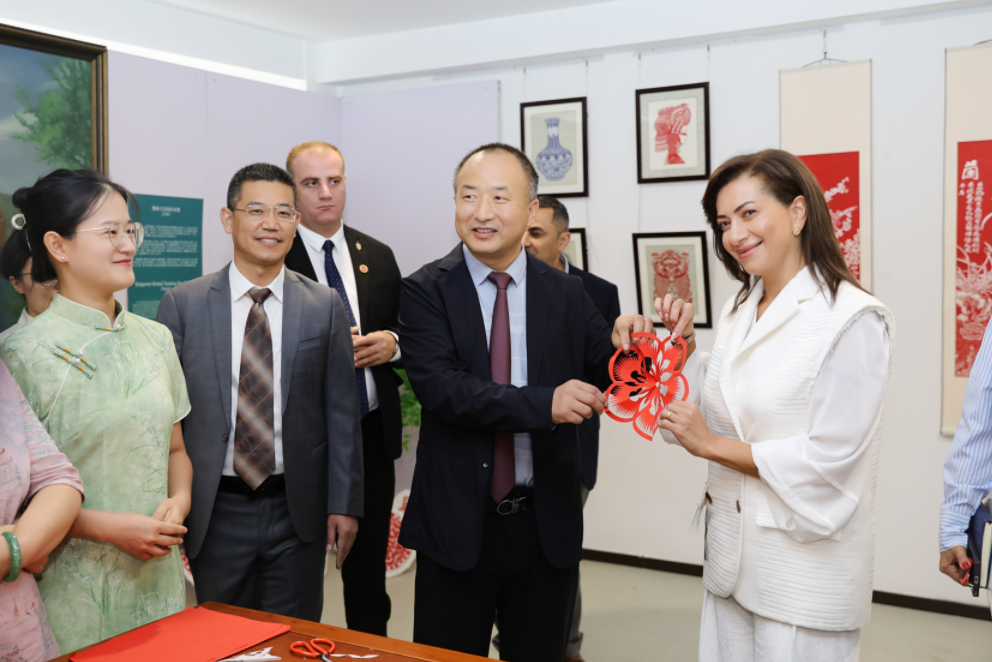 世界汉学中心举行欢迎仪式,热烈欢迎安娜·哈科比扬夫人一行,育英初级中学剪纸社团向安娜·哈科比扬夫人赠送创作的剪纸作品青花瓷长卷。
