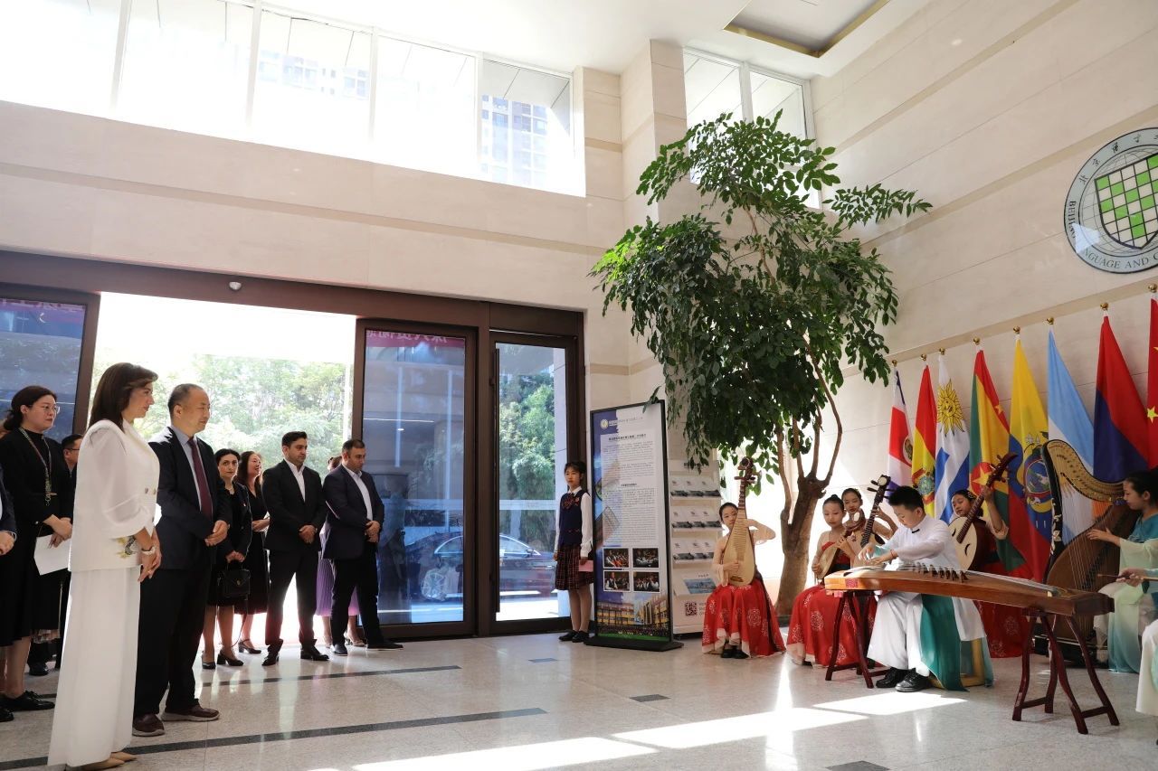 世界汉学中心举行欢迎仪式,热烈欢迎安娜·哈科比扬夫人一行,香江路第二小学小凤凰民乐团演奏中国经典曲目《茉莉花》等。