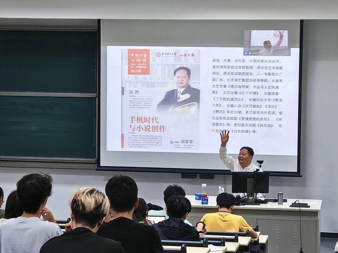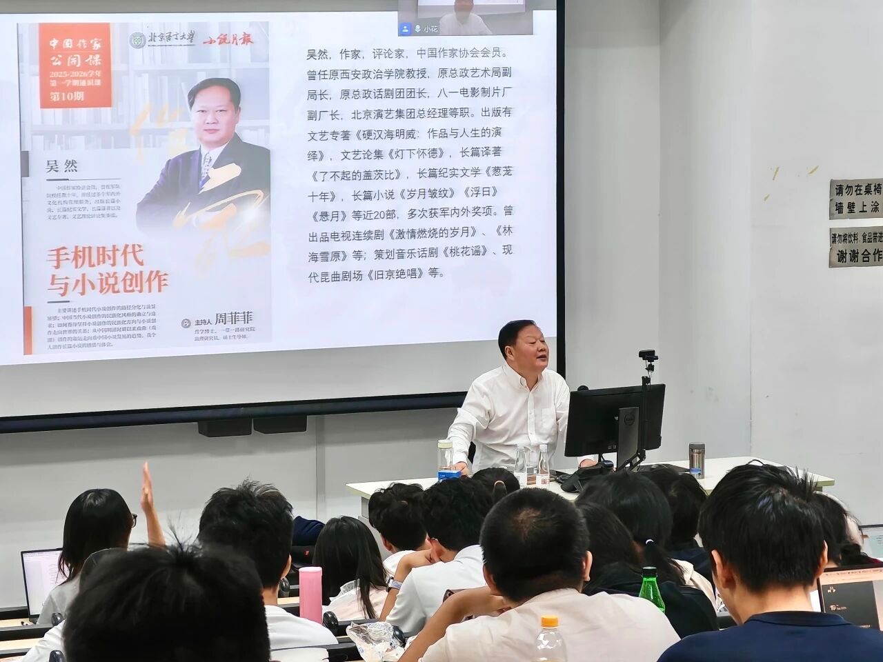 2025年9月19日,北京语言大学“中国作家公开课“重磅回归,本期(总十期)第一次课迎来了著名作家吴然,线上线下三百余名师生共同参与讲座。吴然老师以“手机时代与小说创作”为主题,围绕手机时代小说创作的路径分化与前景展望、中国当代小说创作的民族化风格的确立与追求、从中国明清时期以来的传统戏曲的命运走向看中国小说发展的趋势等问题,以漫谈的形式分享了对小说创作的感悟。