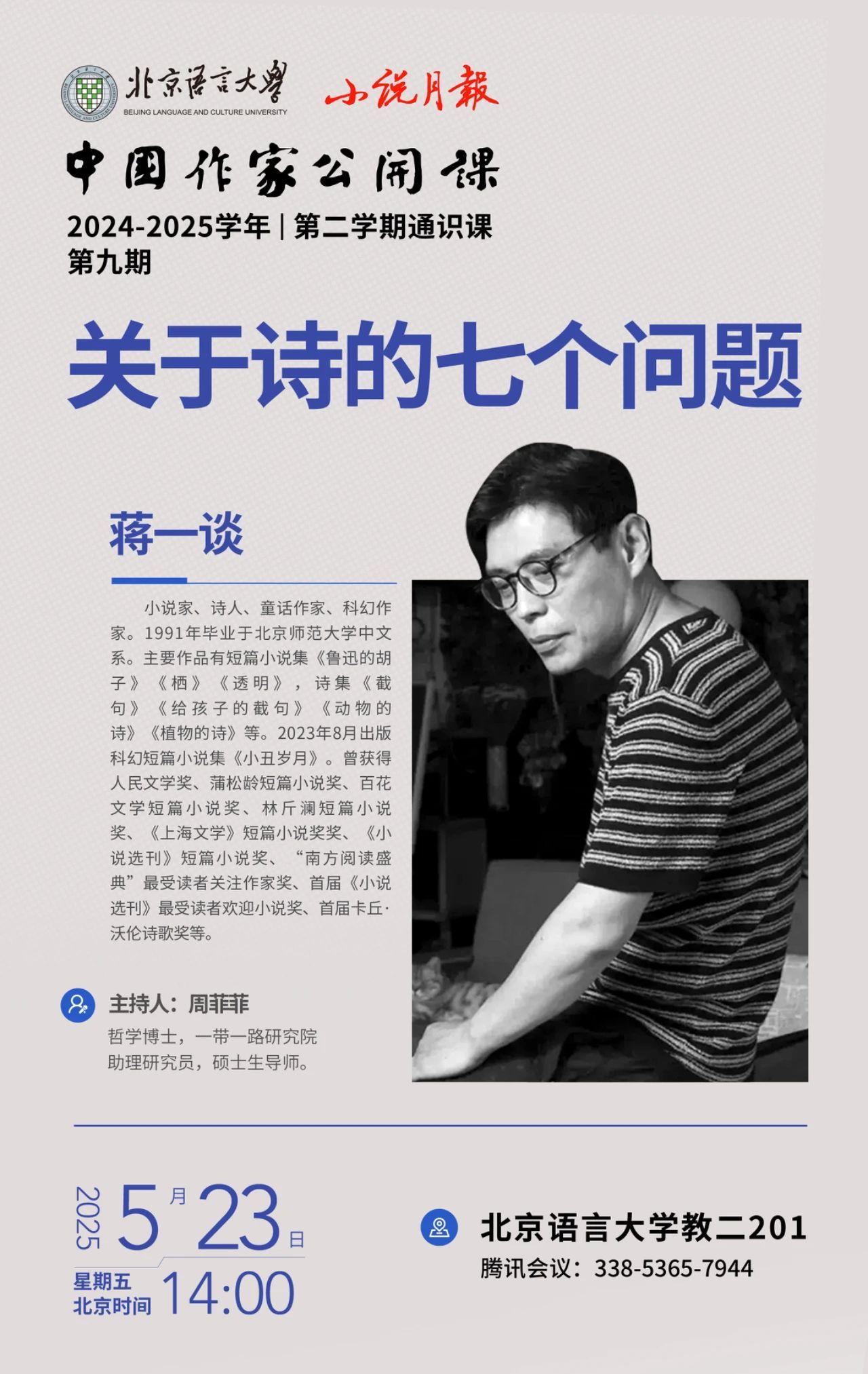 蒋一谈,小说家、诗人、童话作家、科幻作家。1991年毕业于北京师范大学中文系。主要作品有短篇小说集《鲁迅的胡子》《栖》《透明》,诗集《截句》《给孩子的截句》《动物的诗》《植物的诗》等。2023年8月出版科幻短篇小说集《小丑岁月》。曾获得人民文学奖、蒲松龄短篇小说奖、百花文学短篇小说奖、林斤澜短篇小说奖、《上海文学》短篇小说奖奖、《小说选刊》短篇小说奖、“南方阅读盛典”最受读者关注作家奖、首届《小说选刊》最受读者欢迎小说奖、首届卡丘·沃伦诗歌奖等。
